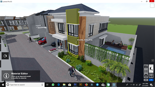 | Ke-1 | Pengenalan singkat tools pada software Lumion, import file 3D model yang akan dibuat animasi dari AutoCAD / SketchUp / 3Ds Max dll, pengaturan material/texturing efek material. |
