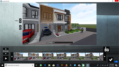 | Ke-3 | Pengaturan rendering image dan animasi (membuat view perspektif, skenario pergerakan kamera, skenario pergerakan manusia dan kendaraan, efek pencahayaan alami dan buatan, efek cuaca, dan efek realistik eksterior/interior. |
